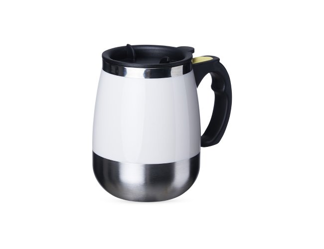 Caneca isotérmica com misturador de bebida, parte interna feita em inox parede dupla com capacidade de 350ml, acabamento colorido em plástico. Contém tampa plástica com bocal e trava de segurança. Para o funcionamento, utiliza-se duas pilhas AAA (não acompanha).