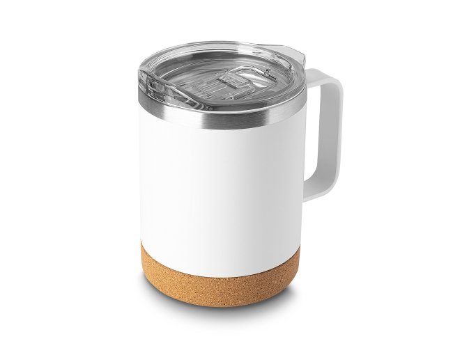 Caneca térmica em aço inox com capacidade 350ml, parede externa com pintura a pó. Parede dupla isolada à vácuo, tampa plástica com anel em silicone para vedação, alça lateral em inox na cor do produto, base em cortiça.