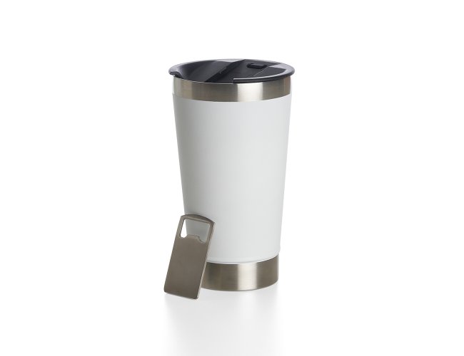 Copo térmico de inox com acabamento liso e capacidade 500ml, material livre de BPA. Contém tampa com abridor.