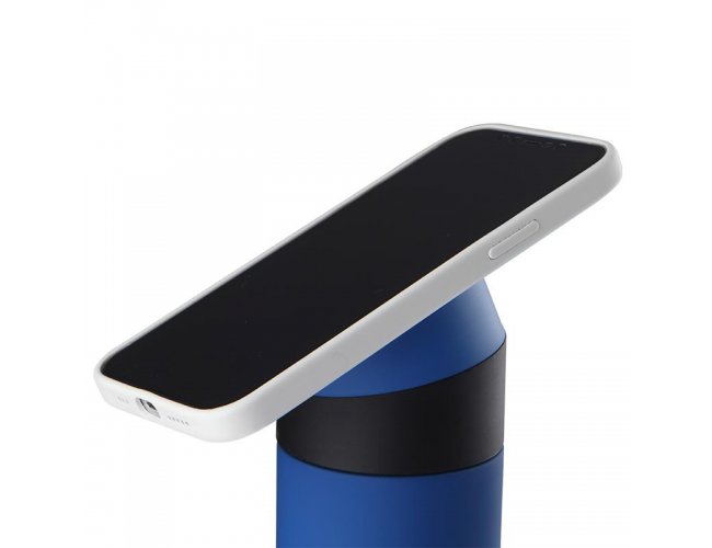 Garrafa térmica em aço inox com parede dupla isolada a vácuo, com capacidade de até 400 ml. Tampa rosqueável com anel de silicone para vedação. Com apoio de silicone para o celular na tampa.