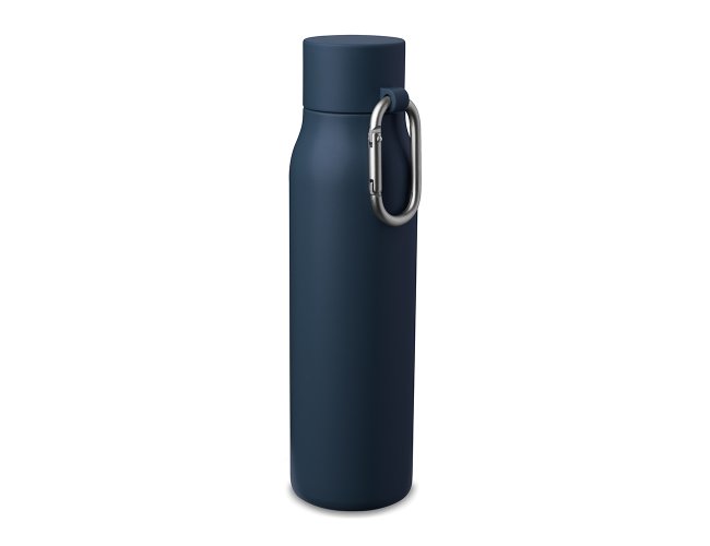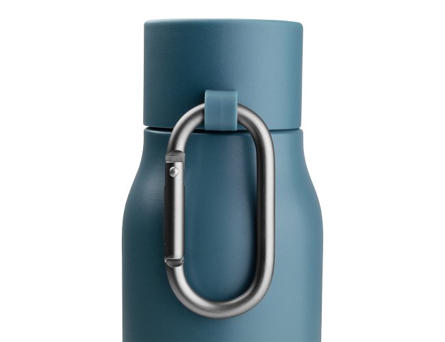 Garrafa Térmica de 550 ml com parede dupla em inox reciclado (externo 304 / interno 201), tampa em plástico PP, mosquetão em alumínio e acabamento com pintura a pó.